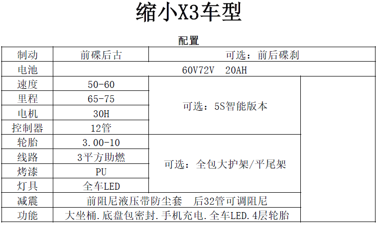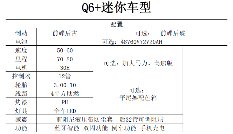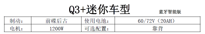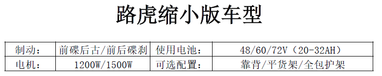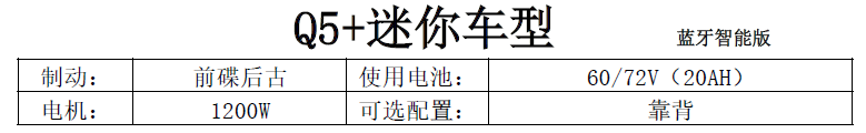 穗牌M6电池容量:72V30AH 电机:1200W 控制器:智能72182 制动方式:前后碟刹220盘 轮胎:前1207012 后2054014 轴距:1280MM 载重:150KG 传动:皮带传动 钢圈:前 3012 后 20514 爬坡度:45度 其他:无电池2025-09-27 03:17:15